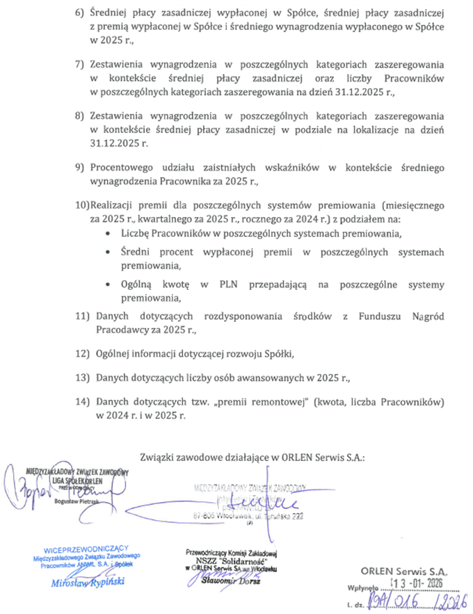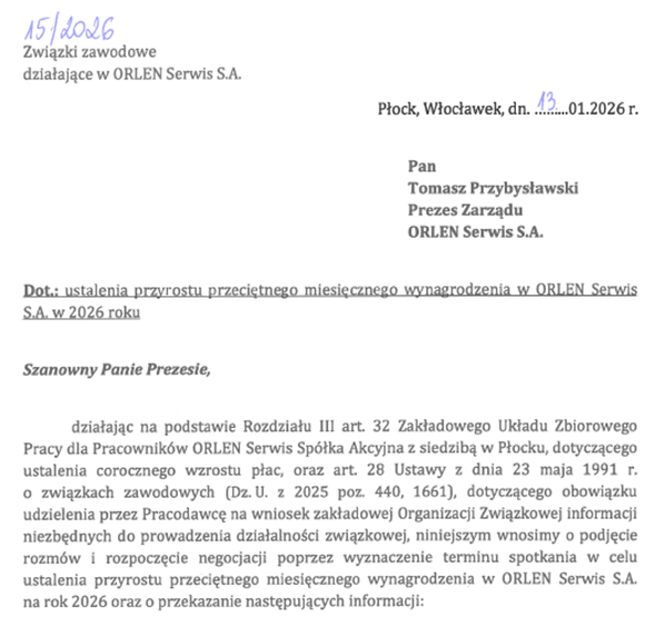 Do tych Spółek, w których negocjacje jeszcze się nie rozpoczęły (ORLEN Serwis S.A., ORLEN Eko Sp. z o.o., ORLEN Ochrona Sp. z o.o., Basell Orlen Polyolefins Sp. z o.o.), złożyliśmy stosowne Pisma z wnioskiem o wyznaczenie terminu negocjacji płacowych.