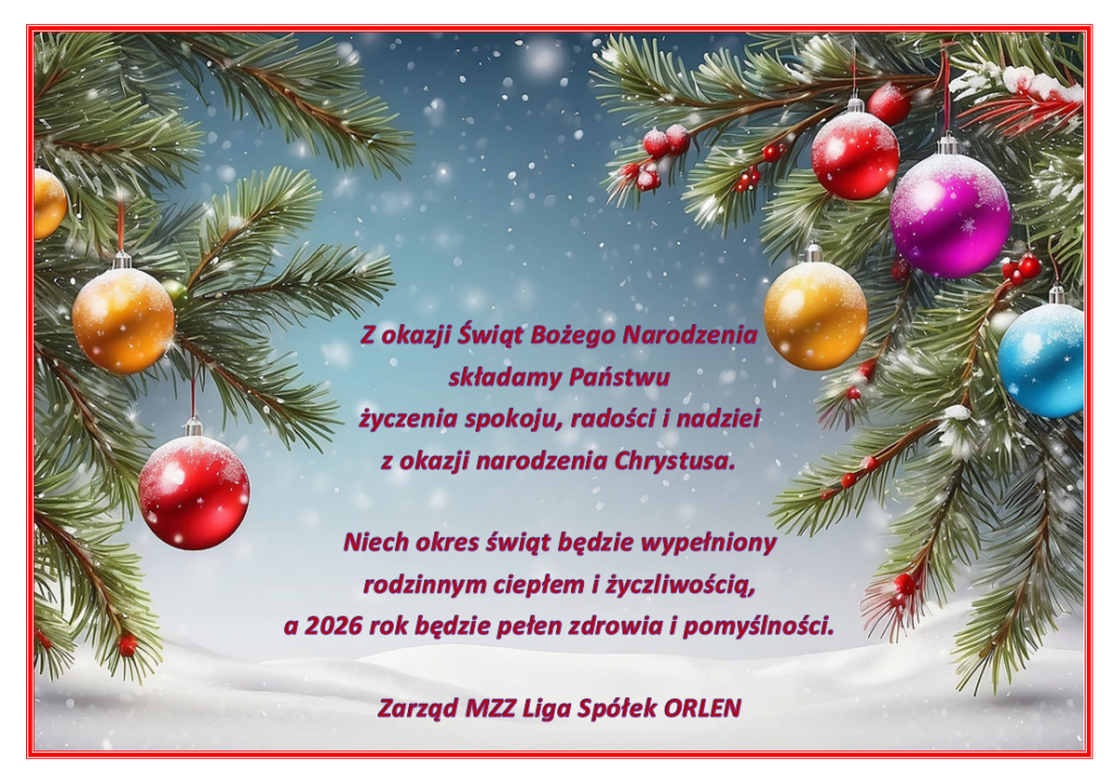 Życzenia Świąteczne Może ci się spodobać również INFORMACJE MZZ LIGA SPÓŁEK ORLEN Z DNIA 11.12.2024 r. 11 grudnia 2024 INFORMACJE MZZ GK Z DNIA 29.05.2023 r. 29 maja 2023 INFORMACJE MZZ GK Z DNIA 30.11.2023 r. 30 listopada 2023